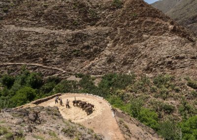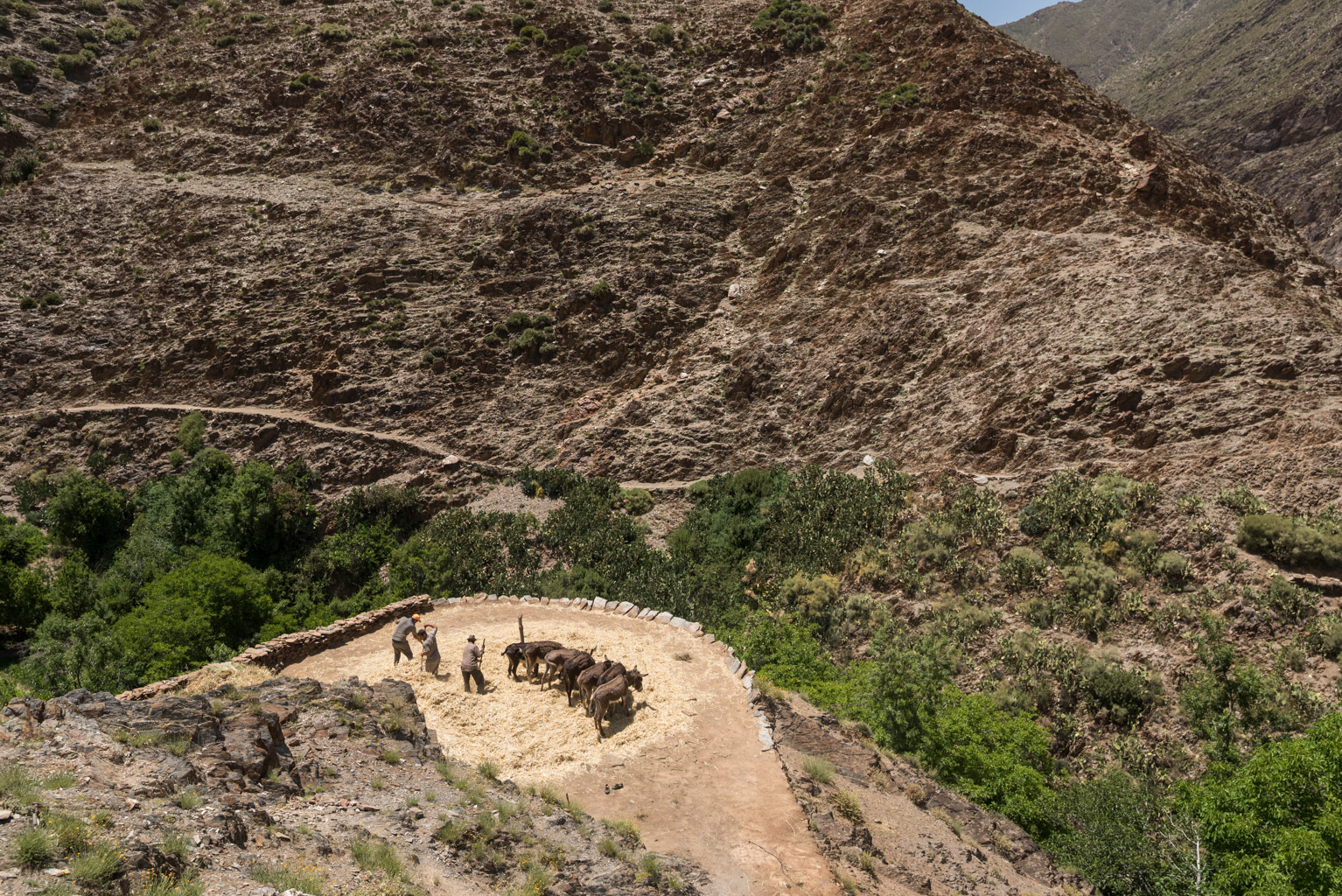 Barley (Hordeum vulgare) is among the crops most cultivated by farmers in the mountainous area of High Atlas. The straw is also used to feed donkeys, chickens and sheep. Local farmers have an ancestral local know-how in terms of driving technique and use of barley. The harvest usually starts in mid-May and is done manually using a sickle. Once the barley is harvested and dried, it is transported to anrar, a place for threshing – a practice to separate the grain or seeds from hay in cereals and or other crops. Threshing is done either in a traditional way using donkeys or mechanically.