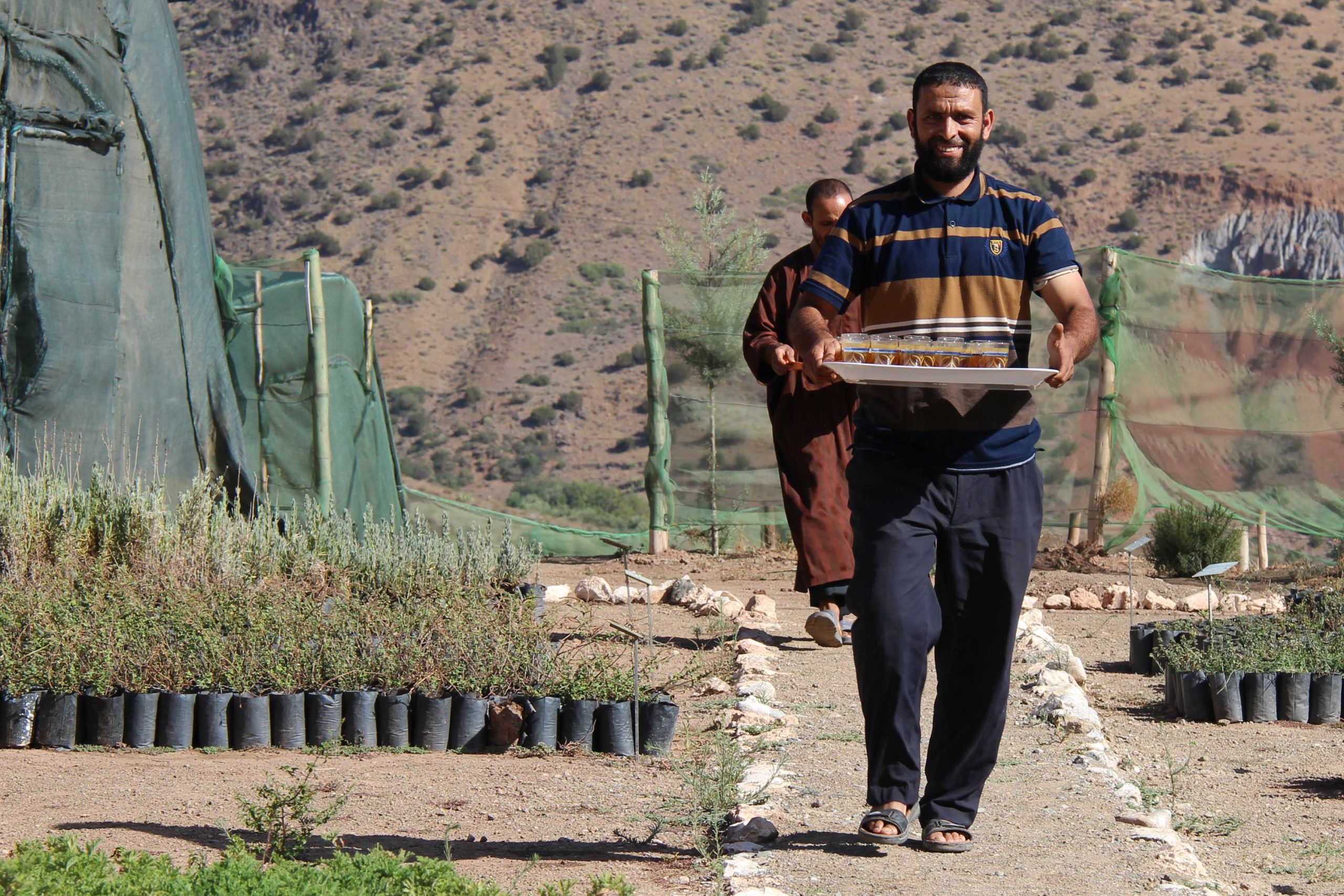 Hamid lives in Igherm, a remote village in the High Atlas Mountains. Every day after his morning prayers he eats a traditional breakfast of bread with olive oil, accompanied with askeef (barley soup), and washes it down with Moroccan mint tea. After breakfast, he makes his way to the community nursery he helped build and now manages where he is cultivating Lavender and Moroccan Wild Thyme.